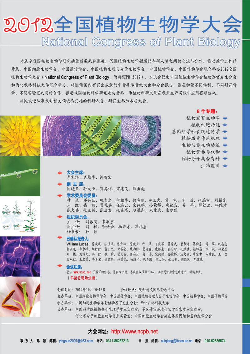 為展示我國植物生物學研究的最新成果和進展,促進我國植物生物學各相關研究領域的科研人員之間的交流與合作,推動教學工作的開展,中國細胞生物學會、中國遺傳學會、中國植物生理學會、中國植物學會和中國作物學會將于20121010-13日聯合舉辦“2012全國植物生物學大會”。 大會將邀請相關領域專家學者做學術報告,研討和交流植物分子生物學和現代農業(yè)研究的最新成果。熱誠歡迎并邀請國內外同行參加研討會。會議詳情請登陸大會網址:www.ncpb.net