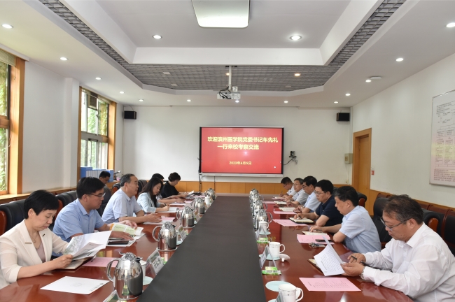 6月5日,濱州醫學院黨委書記車先禮一行來訪,學校黨委書記徐劍波會見車先禮一行,黨委副書記、校長冷暢儉與客人座談,并就學科建設、科學研究、學生工作以及校地合作等進行深入交流。副校長林海參加活動。