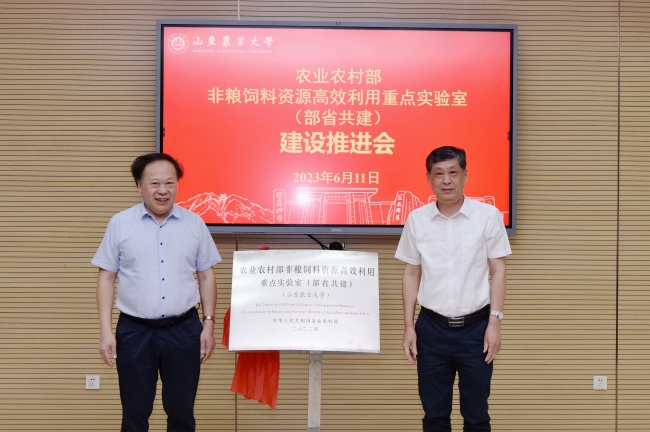 6月11日,山東農業大學農業農村部非糧飼料資源高效利用重點實驗室(部省共建)建設推進會在文理大樓第二會議室舉辦。副校長林海出席活動,并為受聘為重點實驗室學術委員會主任的中國工程院院士、中國農業大學譙仕彥教授頒發聘書。林海和譙仕彥共同為實驗室揭牌。