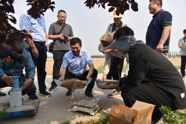 烈日炎炎中,土地丈量、收獲脫粒、稱重、水分測定、取樣測定雜質率等一系列環節結束,專家們給出測產數據:“畝產774.1公斤!”孫維山頗為滿意,李建國更是興奮。作為擁有幾千畝地的種植大戶,一斤小麥多賣幾毛錢收益極為可觀。“今年秋季要多種‘山農48’,抱住這個‘金疙瘩’。”他告訴記者。