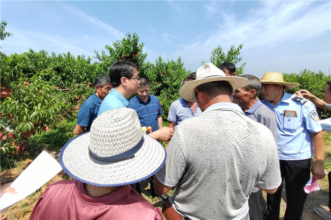 隨行人員中,研究生處處長(zhǎng)許永玉教授是植物保護(hù)專家,他立即聯(lián)系植保學(xué)院院長(zhǎng)原雪峰。接到通知,植保學(xué)院第一時(shí)間啟動(dòng)工作,建立科技支農(nóng)專班,隨即與蒙陰縣林業(yè)局等相關(guān)部門對(duì)接了解桃園病蟲害情況。很快,原雪峰帶著農(nóng)大專家到垛莊鎮(zhèn)現(xiàn)場(chǎng)調(diào)研,實(shí)地了解桃園病蟲害情況,確定需要重點(diǎn)防治的病蟲害類型。