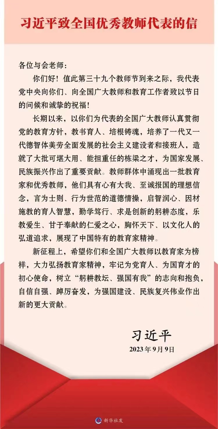 編者按:在第三十九個教師節(jié)到來之際,中共中央總書記、國家主席、中央軍委主席習(xí)近平致信出席全國優(yōu)秀教師代表座談會的各位老師,代表黨中央,向他們和全國廣大教師及教育工作者致以節(jié)日的問候和誠摯的祝福。