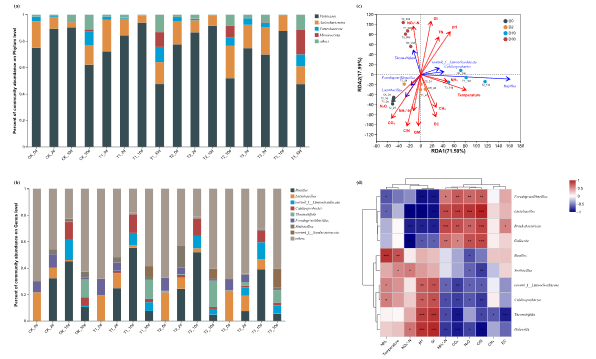 堆肥化過程中的優勢菌門包括厚壁菌門(Firmicutes)、放線菌門(Actinobacteriota)、變形菌門(Proteobacteria)、擬桿菌門(Bacteroidota),優勢菌中絕大多數與大分子有機物分解相關,而芽孢桿菌屬(Bacillus)與氨氣排放顯著正相關,乳桿菌屬(Lactobacillus)與氧化亞氮排放極顯著正相關,假纖毛桿菌屬(Pseudogracilibacillus)、短桿菌屬(Brachybacterium)、葉癭菌屬(Gallicola)與氧化亞氮排放顯著正相關。