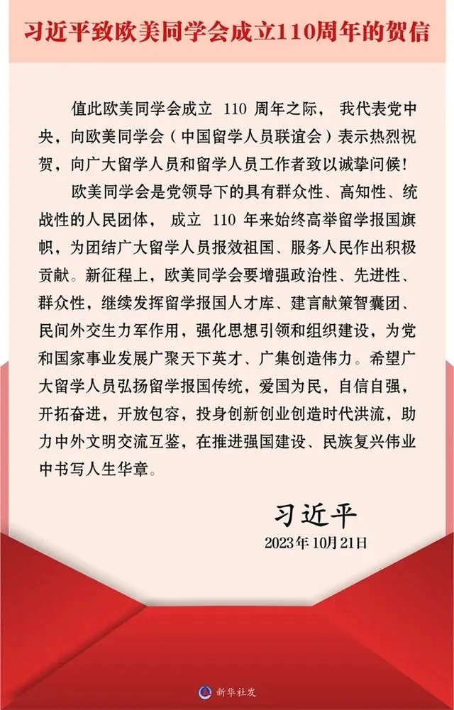 10月21日,歐美同學(xué)會(huì)成立110周年慶祝大會(huì)在京舉行。中共中央總書記、國(guó)家主席、中央軍委主席習(xí)近平發(fā)來(lái)賀信,充分肯定了歐美同學(xué)會(huì)作出的積極貢獻(xiàn),深刻闡明了歐美同學(xué)會(huì)的使命任務(wù),對(duì)廣大留學(xué)人員提出殷切期望,為做好新時(shí)代留學(xué)人員工作提供了根本遵循。