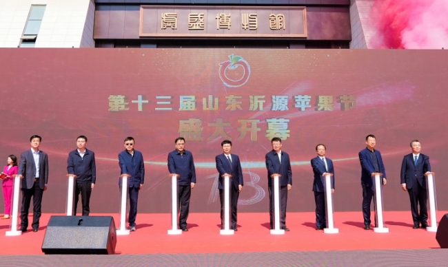 儀式開始前,與會領導和專家一同參觀第十三屆山東沂源蘋果節展位,品嘗沂源蘋果及特色農產品。