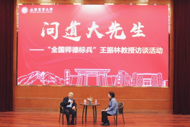 開班儀式上,全體新入職教師進(jìn)行入職宣誓、簽訂《山東農(nóng)業(yè)大學(xué)師德師風(fēng)承諾書》,并為教師代表贈(zèng)送《齊魯時(shí)代楷模余松烈》。“全國師德標(biāo)兵”王振林教授做客“問道大先生”訪談活動(dòng),為新入職教師答疑解惑。