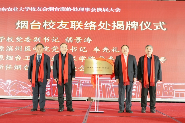 12月16日,山東農業大學校友會煙臺聯絡處理事會換屆大會暨校友論壇在煙臺舉行。山東農業大學黨委副書記嵇景濤,濱州醫學院黨委原書記車先禮,煙臺工程職業技術學院黨委書記趙裕壽,杰出校友、山東益生種畜禽有限公司董事長曹積生出席會議,共同為山東農業大學校友會煙臺聯絡處揭牌。山東農業大學校友會秘書長、教育發展基金會秘書長亓愛收主持論壇。