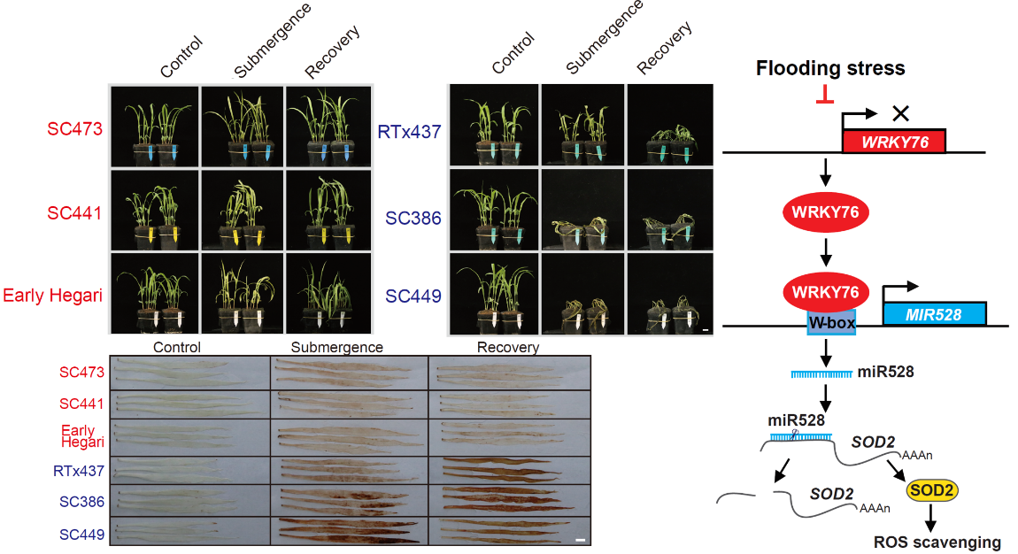 研究發現,在澇漬缺氧條件下,植物體內活性氧(ROS)迅速積累,若清除不及時將造成細胞損傷。不同高粱種質在耐澇性方面存在顯著差異,其活性氧積累水平也明顯不同。通過比較耐澇和敏感型材料的miRNA與mRNA表達譜,鎖定了一個單子葉植物特異的小RNA—miR528,它通過靶向超氧化物歧化酶2(SOD2)基因影響活性氧清除過程。進一步研究顯示,miR528編碼基因的表達受到轉錄因子WRKY76的直接激活。在敏感材料中WRKY76基因表達較高,而過量表達WRKY76或miR528均會導致植株耐澇性顯著降低,表明WRKY76-miR528模塊在高粱應答淹水脅迫中發揮負調控作用。