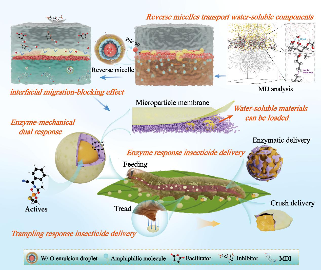 團隊提出了一種基于表面活性劑膠束自組裝制備農藥微囊的新策略:基于現有的界面聚合微囊化技術原理,首先利用反膠束“運送”水分子在油/水界面上形成微粒層,在其表面再生成一層致密薄膜,從而構建出類似動物細胞膜的仿生界面膜結構囊殼。這種特殊囊殼不僅可以負載水溶性活性物質,還可以在害蟲取食(消化酶作用)和爬行(機械壓力)的刺激下實現智能響應釋放(圖1)。