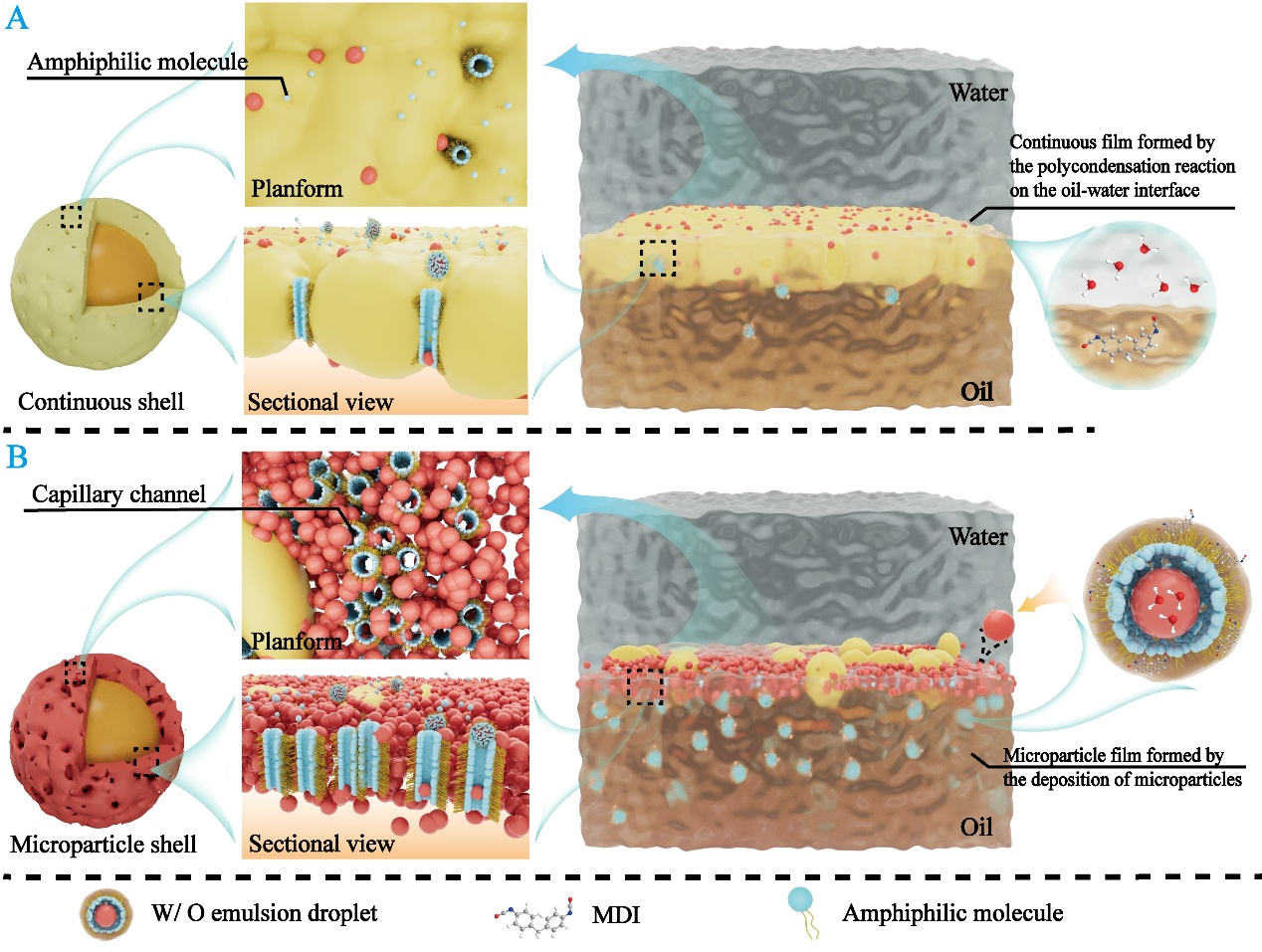 該研究系統揭示了在界面聚合過程中兩親分子對水相傳質和囊殼結構的關鍵調控作用。研究發現,聚羧酸鹽(PCE)可形成反膠束,將水相以乳滴形式跨界面輸運至油相,進一步,乳滴中的水與異氰酸酯反應生成微米級顆粒,最終形成多孔的“微粒型”界面膜;而木質素磺酸鈉(SL)作為兩親分子時,界面縮聚過程則傾向于形成致密連續的界面膜(圖2)