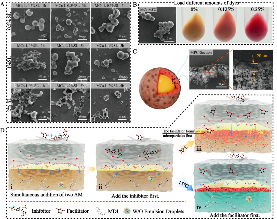 基于上述過程,研究團隊進一步開發了低溫約束界面聚合策略,通過調整PCE和SL的添加順序和反應溫度,成功構建了具有“內層微粒-表面致密層”的微粒型囊殼(圖3)。該結構既保證了囊芯的穩定性,又能夠響應害蟲的力學刺激,同時借助內層微粒所特有的負載水溶性物質的功能,還能夠進一步拓展載藥微囊的應用性能。