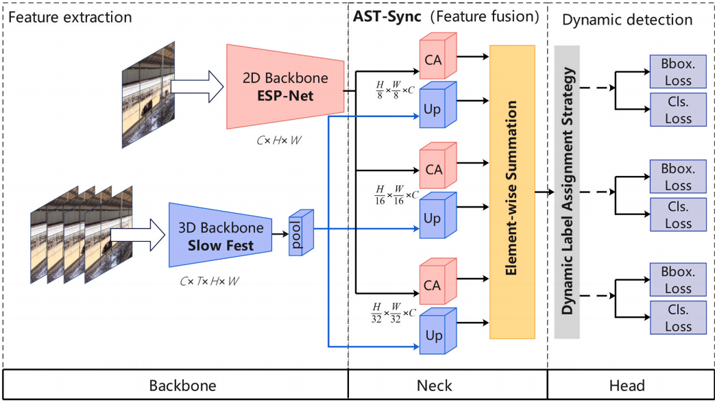 針對以上問題,團隊提出了一種基于巡檢機器人和時空特征融合算法(Cattle-ES3D)的肉牛呼吸急促和流涎行為檢測方法(圖1)。團隊首先提出了一種混合架構,將嵌入式空間金字塔網絡和SlowFast雙通路網絡集成在一起,實現肉牛行為時空特征的提取;其次,設計了自適應時空特征融合同步模塊,實現時空特征的自適應融合;最后,設計了一個輕量級的動態檢測分支,通過時空動態標簽賦值驅動的多維參數優化機制,實現分類-回歸特征空間對齊和時間關聯約束。實驗結果表明,該方法具有時空特征,提高了肉牛呼吸急促和流涎行為的檢測精度,降低了計算成本。