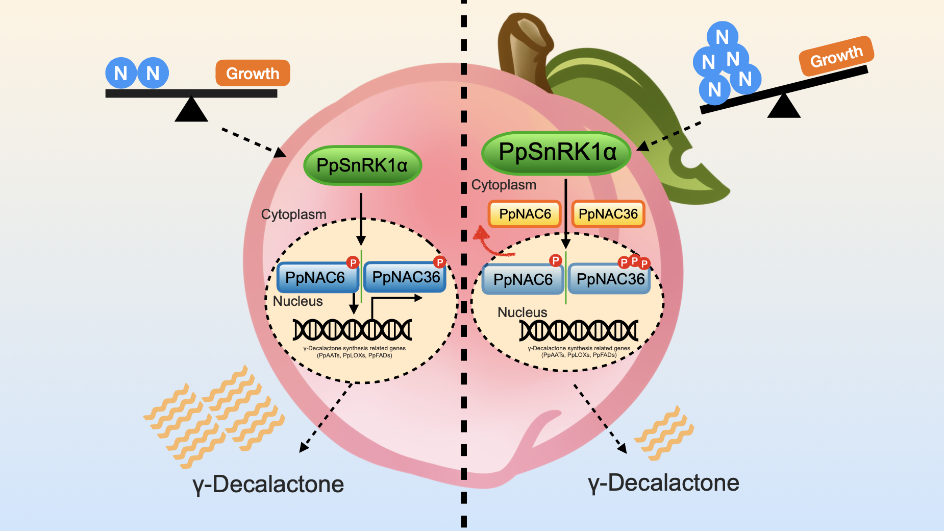 桃子因其獨(dú)特的香氣和風(fēng)味深受消費(fèi)者喜愛,具有重要的經(jīng)濟(jì)與營養(yǎng)價(jià)值。在成熟過程中,桃子會由“青草香”逐漸轉(zhuǎn)變?yōu)橐怎ヮ惡蛢?nèi)酯類為主的“果香”,其中γ-癸內(nèi)酯正是構(gòu)成其典型“桃香”的核心物質(zhì)。然而,過量施氮肥會顯著降低桃子香氣物質(zhì)積累,成為桃產(chǎn)業(yè)可持續(xù)發(fā)展的主要障礙。因此解析氮素調(diào)控“桃香”合成背后的關(guān)鍵因子及其作用機(jī)制對桃產(chǎn)業(yè)的發(fā)展至關(guān)重要。
