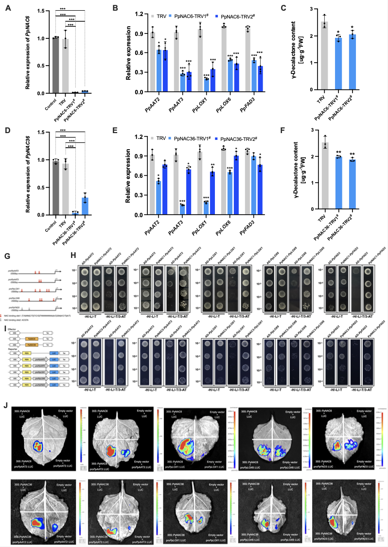 該研究通過大田試驗(yàn)觀測,過量施氮會抑制桃果實(shí)中γ-癸內(nèi)酯的生物合成。通過在不同氮處理下的基因表達(dá)譜及香氣成分相關(guān)性分析,鑒定出兩個(gè)參與響應(yīng)氮信號調(diào)控γ-癸內(nèi)酯的生物合成的NAC家族轉(zhuǎn)錄因子PpNAC6和PpNAC36。通過在桃果實(shí)及愈傷組織中構(gòu)建沉默/過表達(dá)材料,發(fā)現(xiàn)PpNAC6和PpNAC36正向調(diào)控γ-癸內(nèi)酯的積累。進(jìn)一步分析證實(shí)PpNAC6和PpNAC36可直接結(jié)合γ-癸內(nèi)酯生物合成相關(guān)基因(PpAAT2、PpAAT3、PpLOX1、PpLOX6和PpFAD3)的啟動子區(qū)域,并顯著增強(qiáng)其轉(zhuǎn)錄。