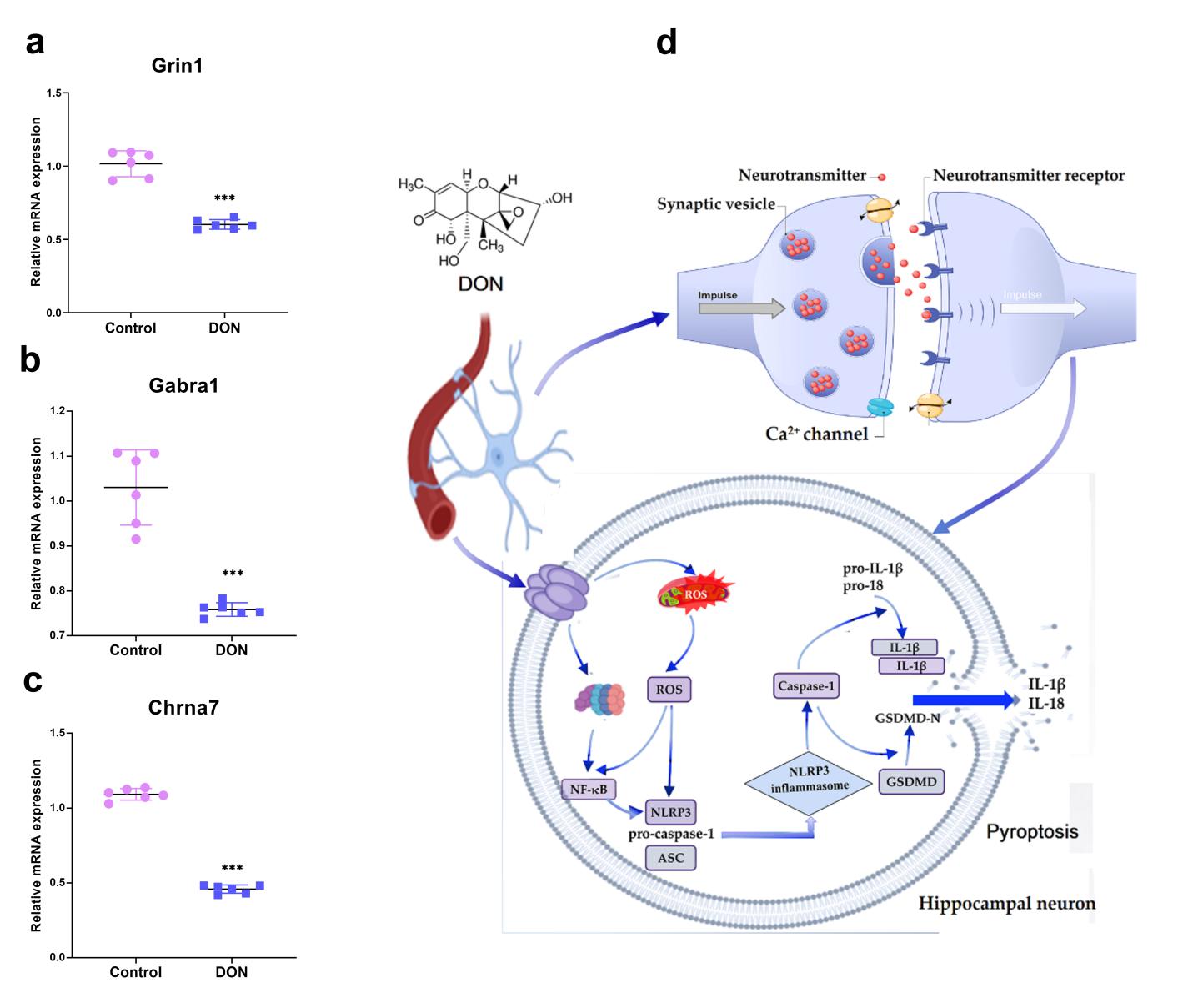 脫氧雪腐鐮刀菌烯醇(DON)是一種廣泛存在于小麥、玉米等谷類作物及飼料中的單端孢霉烯類霉菌毒素。該毒素可通過食物鏈對(duì)人類和動(dòng)物健康造成嚴(yán)重威脅,引發(fā)包括腸道、肝臟及腎臟在內(nèi)的多器官毒性反應(yīng)。值得注意的是,DON能夠直接穿透血腦屏障,干擾神經(jīng)系統(tǒng)的穩(wěn)態(tài)。近年來的研究表明,長(zhǎng)期低劑量暴露于DON等霉菌毒素可能增加罹患神經(jīng)退行性疾病的風(fēng)險(xiǎn)。鑒于神經(jīng)退行性疾病與海馬體區(qū)域的免疫炎癥反應(yīng)密切相關(guān),海馬體可能成為DON誘發(fā)神經(jīng)炎癥的關(guān)鍵靶器官。因此,本研究通過構(gòu)建體外與體內(nèi)實(shí)驗(yàn)?zāi)P停到y(tǒng)探討DON誘導(dǎo)海馬神經(jīng)細(xì)胞焦亡的作用機(jī)制。研究結(jié)果顯示,DON暴露可導(dǎo)致ROS過度生成,激活NF-κB信號(hào)通路,并上調(diào)NLRP3和ASC蛋白的表達(dá)水平,進(jìn)而激活Caspase-1,促進(jìn)炎癥因子IL-1β與IL-18的成熟與釋放,最終引發(fā)焦亡反應(yīng),造成海馬神經(jīng)元損傷。此外,DON顯著干擾了海馬神經(jīng)細(xì)胞中多種神經(jīng)遞質(zhì)的合成與釋放過程。相關(guān)性分析進(jìn)一步表明,這些神經(jīng)遞質(zhì)的變化與阿爾茨海默病的發(fā)生密切相關(guān),提示長(zhǎng)期低劑量DON暴露可能是神經(jīng)退行性疾病發(fā)展的重要風(fēng)險(xiǎn)因素。本研究不僅揭示了DON誘導(dǎo)海馬神經(jīng)細(xì)胞焦亡的分子機(jī)制,還發(fā)現(xiàn)其對(duì)神經(jīng)遞質(zhì)穩(wěn)態(tài)的破壞作用,為深入解析DON的毒理機(jī)制提供了新的研究視角。抑制Caspase-1炎性體的活性,從而緩解DON引發(fā)的神經(jīng)炎癥反應(yīng),可能成為一種具有前景的神經(jīng)保護(hù)策略。
