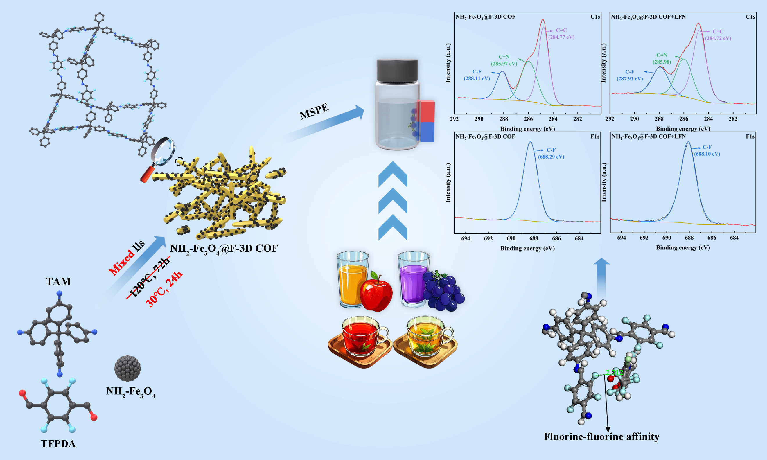 苯甲酰脲類殺蟲劑(BUs)作為一種獨(dú)特的昆蟲生長調(diào)節(jié)劑,與傳統(tǒng)神經(jīng)毒性殺蟲劑不同,它通過靶向昆蟲體內(nèi)的幾丁質(zhì)合成破壞其蛻皮過程,并抑制其生長發(fā)育。盡管BUs因功效顯著被廣泛用于保護(hù)農(nóng)作物,但存在降解速度較慢,易對(duì)人類健康和生態(tài)系統(tǒng)構(gòu)成潛在威脅等突出。因此設(shè)計(jì)一種簡(jiǎn)單、快速和高靈敏度的BUs分析檢測(cè)方法起著至關(guān)重要的作用。與二維COFs相比,三維(3D)COFs的分子單元通過空間中的共價(jià)鍵形成3D網(wǎng)絡(luò)結(jié)構(gòu),使得它們具有高度互連的多孔結(jié)構(gòu),突出暴露的活性位點(diǎn)和出色的熱穩(wěn)定性。課題組采用混合離子液體介導(dǎo)的Schiff聚合方法,在室溫下成功合成磁性結(jié)晶氟功能化3D COF(NH?-Fe?O?@F-3D COF),發(fā)現(xiàn)并證實(shí)其高效檢測(cè)果汁和飲料中的 BUs。這成果對(duì)于識(shí)別和定量復(fù)雜基質(zhì)食品中存在的污染物表現(xiàn)出廣泛應(yīng)用前景。