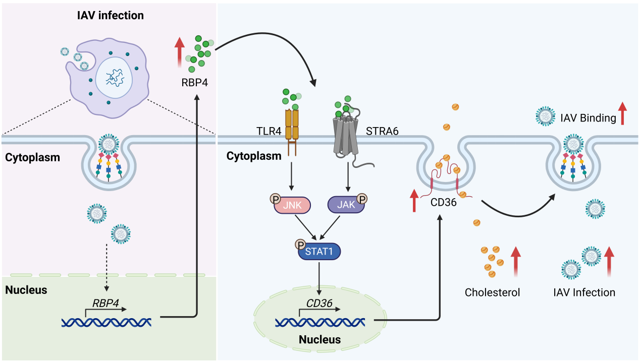 該研究不僅闡明了 IAV利用宿主脂質代謝網絡以促進自身復制的新策略,還首次揭示RBP4-CD36-膽固醇穩態軸在流感病毒感染與致病過程中的重要作用,為開發以宿主脂質代謝為靶點的廣譜抗流感病毒藥物提供了理論依據和潛在靶點。