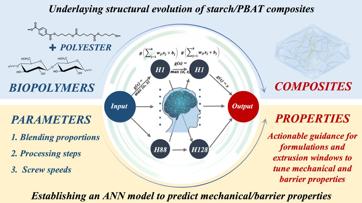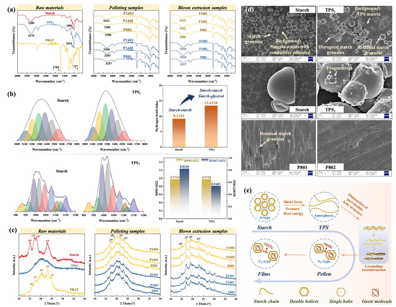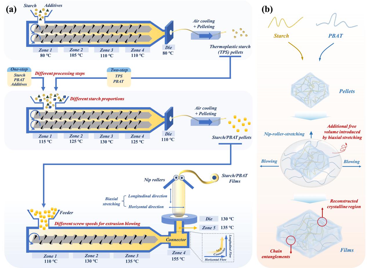 淀粉/聚對苯二甲酸-己二酸丁二醇酯(PBAT)復合材料是一種有前途的可生物降解材料,可用作食品、農業等多行業的可持續膜材。然而,雙相體系的成膜過程較為復雜,難以系統地解析淀粉與PBAT在混合加工過程中所經歷的分子結構、結晶結構及相結構轉變。此外,大多數研究受限于樣本數量較少,缺乏在加工參數與薄膜性能之間建立穩健的關聯、預測模型。