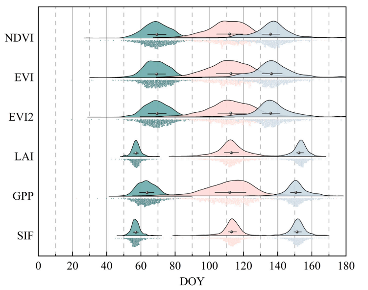 研究基于2000~2023年數據,對比了冬小麥主產區華北平原地區太陽誘導葉綠素熒光(SIF)與常用遙感指標歸一化植被指數(NDVI)、增強植被指數(EVI)、兩波段增強植被指數(EVI2)、葉面積指數(LAI)及總初級生產力(GPP)等提取的冬小麥物候信息。結果表明,由SIF提取的物候指標在捕捉物候變化時展現出更優的穩定性,物候階段劃分清晰且無重疊現象。SIF提取結果表明冬小麥返青期(GUD)主要集中在每年第52~62天,52.4%的區域呈提前趨勢;抽穗期(HE)集中在第115~125天,58.7%的區域呈延遲趨勢;成熟期(MA)集中在第152~160天,58.6%的區域呈延遲趨勢。通過分析置信橢圓,最普遍的物候變化模式(占比23.67%)表現為三個生長階段均提前,空間分布呈“東南—西北”走向。溫度是物候期提前的主要驅動因素,而降水的影響雖整體有限,但隨生長季推進,其影響程度逐漸增強。這些研究結果凸顯了作物物候研究中指標選擇的重要性,并為氣候變化背景下的適應性水資源管理策略提供了指導。