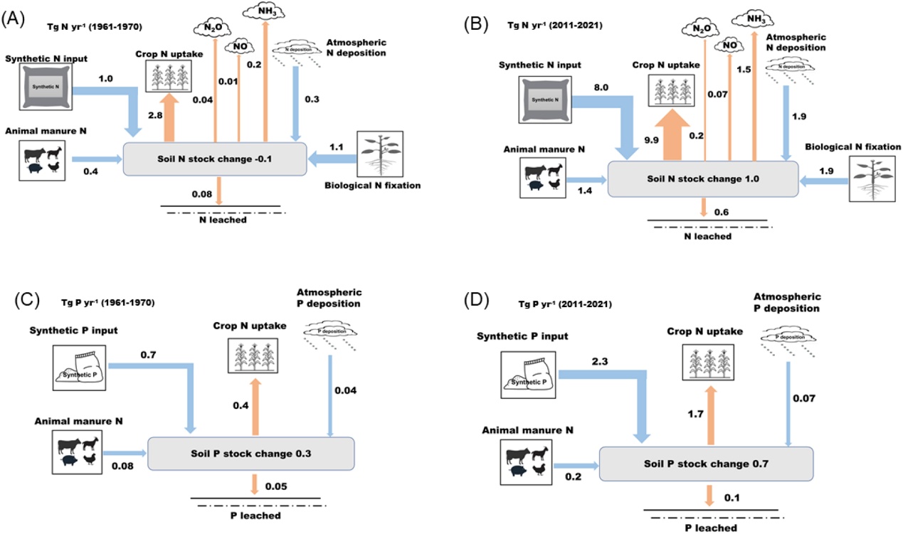 本研究系統(tǒng)分析了1961-2021年非洲各國(guó)家的氮磷養(yǎng)分流動(dòng)動(dòng)態(tài)及其驅(qū)動(dòng)因素。結(jié)果表明,非洲農(nóng)田氮輸入量由17.9 kg ha-1增至46.9 kg ha-1,磷輸入量由4.8 kg ha-1增至9.5 kg ha-1,但仍遠(yuǎn)低于全球平均水平。氮利用效率從91.3%下降至74.6%,而磷利用效率從57.8%上升至64.3%,可見(jiàn)非洲氮磷養(yǎng)分管理的不平衡性。目前北非農(nóng)產(chǎn)品卡路里和蛋白質(zhì)日供應(yīng)量已達(dá)日推薦量,但撒哈拉以南國(guó)家仍低于該值。人均GDP、能量供應(yīng)與氮磷利用效率呈顯著負(fù)相關(guān),但依區(qū)域而異,未來(lái)需制定區(qū)域差異化的氮磷養(yǎng)分管理策略。