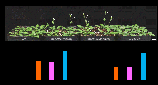 擬南芥MAPKKK18在干旱及ABA信號轉(zhuǎn)導過程中發(fā)揮重要功能。該研究發(fā)現(xiàn)MAPKKK18超表達株系的開花時間明顯早于野生型,而mapkkk18突變體則顯著晚花(圖1)。MAPKKK18的下游組分MAPKK3及MAPK1/2/7/14突變后擬南芥的開花時間均延遲,表明MAPKKK18-MAPKK3-MAPK1/2/7/14級聯(lián)途徑正調(diào)控擬南芥開花時間。