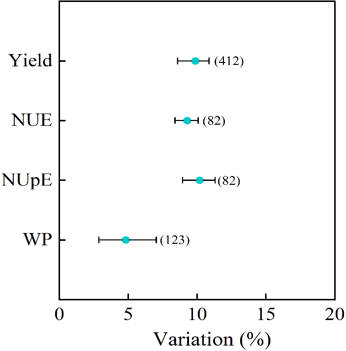 圖2 寬幅播種與常規條播對小麥產量、氮素利用效率(NUE)、氮素吸收效率(NUpE)和水分生產力(WP)的影響(圓點表示均值,誤差線代表95%置信區間(CIs),置信區間括號內的數字表示樣本量,下同)