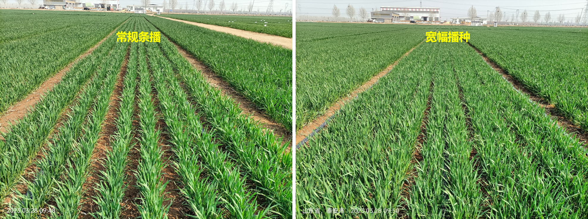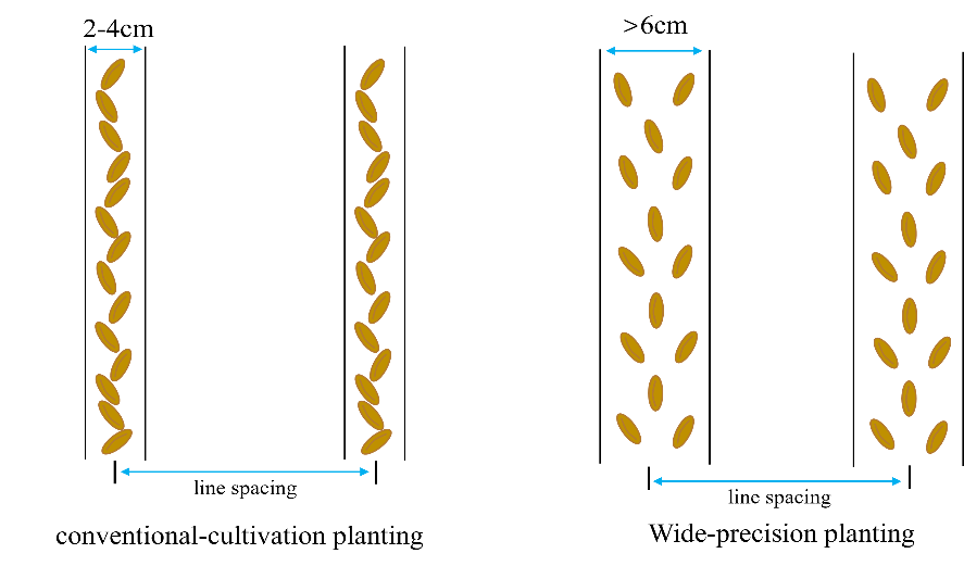 圖1 小麥常規條播與寬幅播種大田對比圖和示意圖