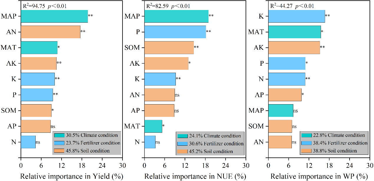 研究發現,與常規條播相比,寬幅播種使小麥產量提升9.9%、氮素利用效率(NUE)提升9.3%、氮素吸收效率提升(NUpE)10.2%、水分生產力(WP)提升4.8%。土壤條件對寬幅播種下的小麥產量、氮素利用效率和水分生產率影響最大,尤其是適宜的土壤有機質含量和速效鉀含量。肥料和氣候因素也會影響寬幅播種小麥的綜合生產能力。隨機森林回歸模型顯示,小麥生產中應更加重視鉀肥和磷肥的施用,以更大程度實現寬幅播種的增產效應。此外,在年平均降水量較高(>600毫米)、年平均氣溫適中(10-13℃)的條件下,寬幅播種更易實現產量、氮素利用效率和水分生產力的協同提升。綜上,寬幅播種可顯著提高小麥綜合生產能力,研究為小麥大面積單產提升行動中持續推廣寬幅播種技術提供了新的參考和借鑒。