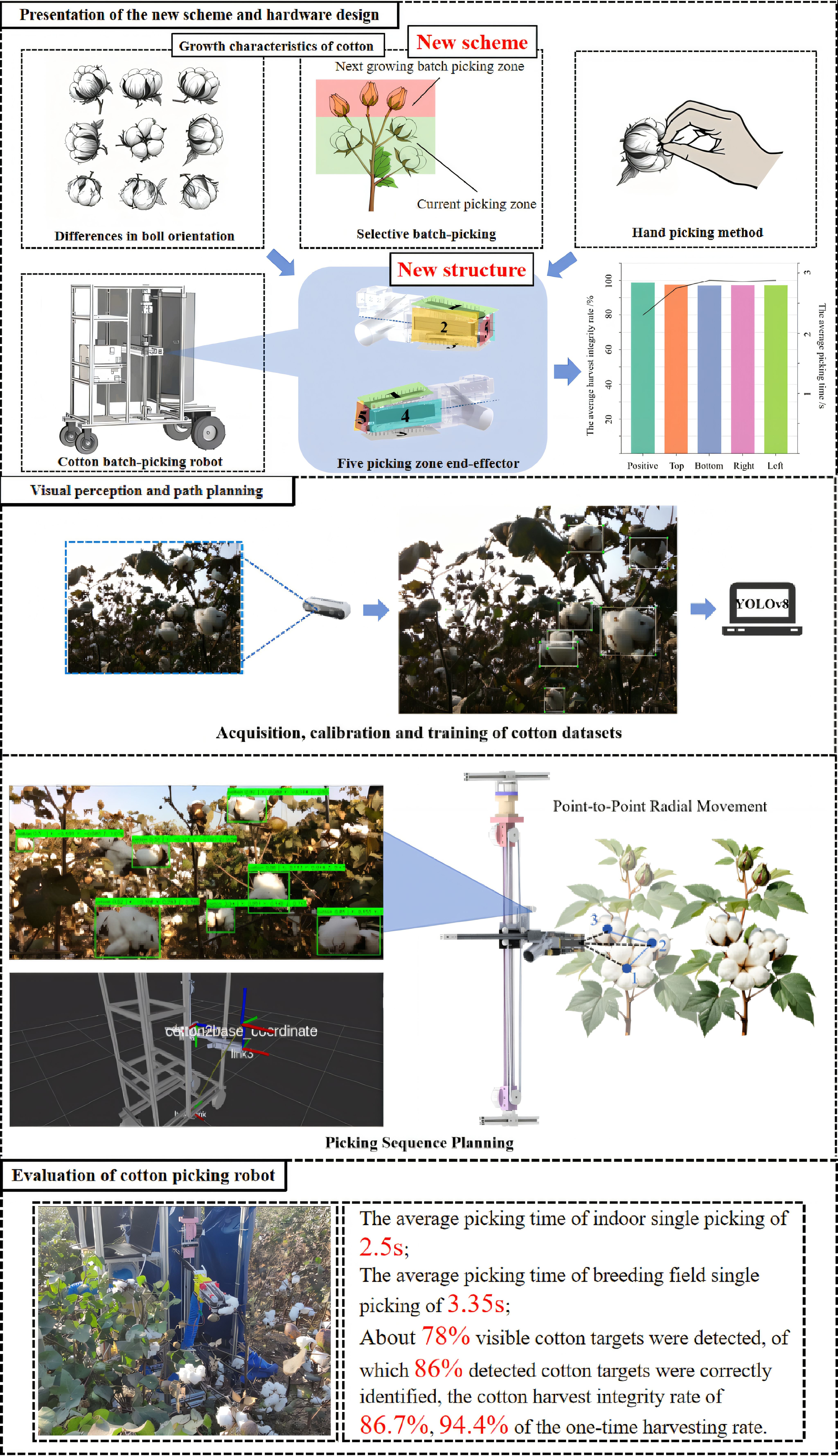 針對小地塊棉花多批次選擇性采收的技術難題,研究團隊提出了一種創新性的機械化采收方案。團隊設計了基于五采摘區(FPZ)結構的末端執行器,通過多采摘區協同作業,實現不同姿態棉鈴的高效選擇性采摘;結合多批次采收方式,能夠針對成熟期差異明顯的棉鈴進行分期采摘。同時,團隊構建了基于ROS2的多機械臂選擇性采收智能控制系統,完成了軟硬件集成、調試與優化。該研究通過結構創新與作業模式創新結合,突破了小地塊棉花多批次選擇性采收的關鍵技術瓶頸,為分散種植區域提供了可行的機械化解決方案,也為提升棉花育種效率、降低人工成本、推動棉花采收智能化發展奠定了技術基礎。隨著技術在育種田塊的成熟與優化,未來有望推廣至分散種植或大面積生產區域,實現小批次智能采收向規?;瘷C械化采收的轉化,提升區域棉花生產效率和產品品質,推動棉花產業智能化升級。