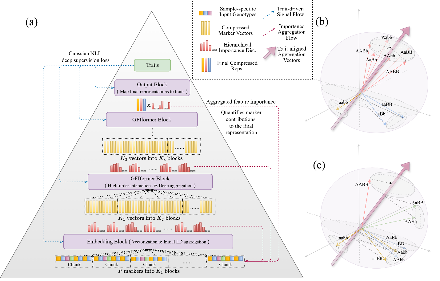 近日,機械電子工程學院劉平教授、生命科學學院李祥教授聯合中國農業科學院果樹研究所王海波研究員在《Plant Biotechnology Journal》上發表了題為“DNAwhisper: An Integrated Deep Learning Pyramidal Framework for Multi-Trait Genomic Prediction and Adaptive Marker Prioritisation”的研究論文,提出了可解釋的深度學習全基因組選擇計算方法,助力作物復雜表型的早期預測和復雜數量性狀遺傳效應挖掘。機電學院博士后馬岳鑫為第一作者,劉平教授、李祥教授和王海波研究員為共同通訊作者。