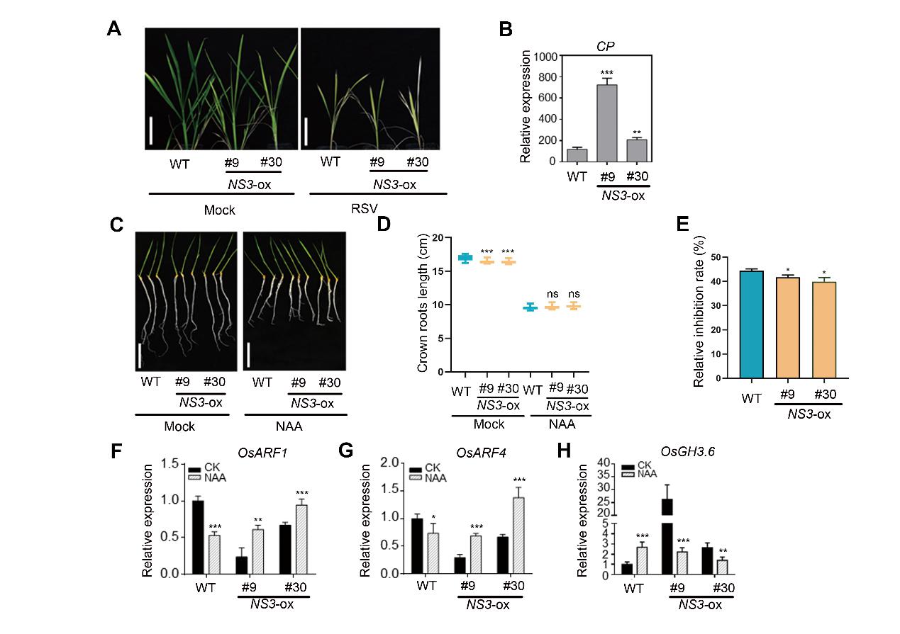 研究發現,RSV侵染導致水稻出現矮化與根系發育不良的表型,并顯著降低水稻對外源生長素類似物NAA的響應敏感性。實驗結果表明,RSV編碼的NS3蛋白與水稻生長素信號通路中的OsIAA25蛋白互作。在水稻中異源表達NS3不僅增強了植株對RSV的感病性,同時也降低了對NAA的敏感性。以上結果表明,RSV NS3蛋白通過干擾生長素信號轉導途徑,促進病毒侵染并影響水稻生長。