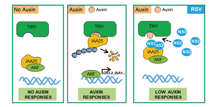 進一步研究發現,當感染RSV時,NS3特異性結合水稻OsIAA25蛋白抑制OsIAA25和OsTIR1的結合,從而抑制OsIAA25蛋白的降解過程。OsIAA25的積累會劫持OsARFs,抑制與生長素反應相關的基因的表達,進而抑制生長素信號通路,最終促進病毒的感染。NS2能夠與NS3結合,二者協同顯著增強了OsIAA25的穩定性。