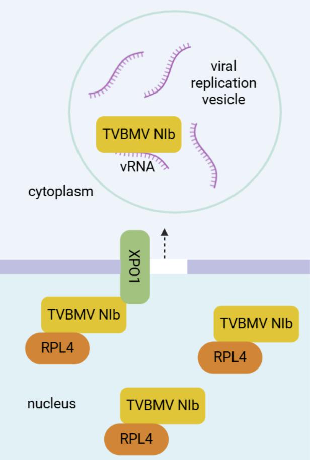 在此研究基礎上,團隊圍繞核糖體蛋白調控煙草脈帶花葉病毒侵染的分子機制,及其在作物抗病毒育種中的應用價值展開深入探索。在本研究中,發現非葉綠體定位的核糖體蛋白RPL4與煙草脈帶花葉病毒NIb互作,而同屬的馬鈴薯Y病毒和蕪菁花葉病毒NIb均不存在互作。過表達RPL4抑制煙草脈帶花葉病毒侵染,而不影響馬鈴薯Y病毒和蕪菁花葉病毒侵染。進一步研究發現,RPL4對煙草脈帶花葉病毒侵染的抑制程度與RPL4的核質分布呈正相關。RPL4通過干擾XPO1介導的NIb核輸出,阻礙NIb向病毒復制囊泡轉運而抑制煙草脈帶花葉病毒侵染。該研究工作揭示了核糖體蛋白對植物病毒侵染的差異性調控機制,為抗馬鈴薯Y病毒屬病毒的防控及作物育種提供重要理論依據。