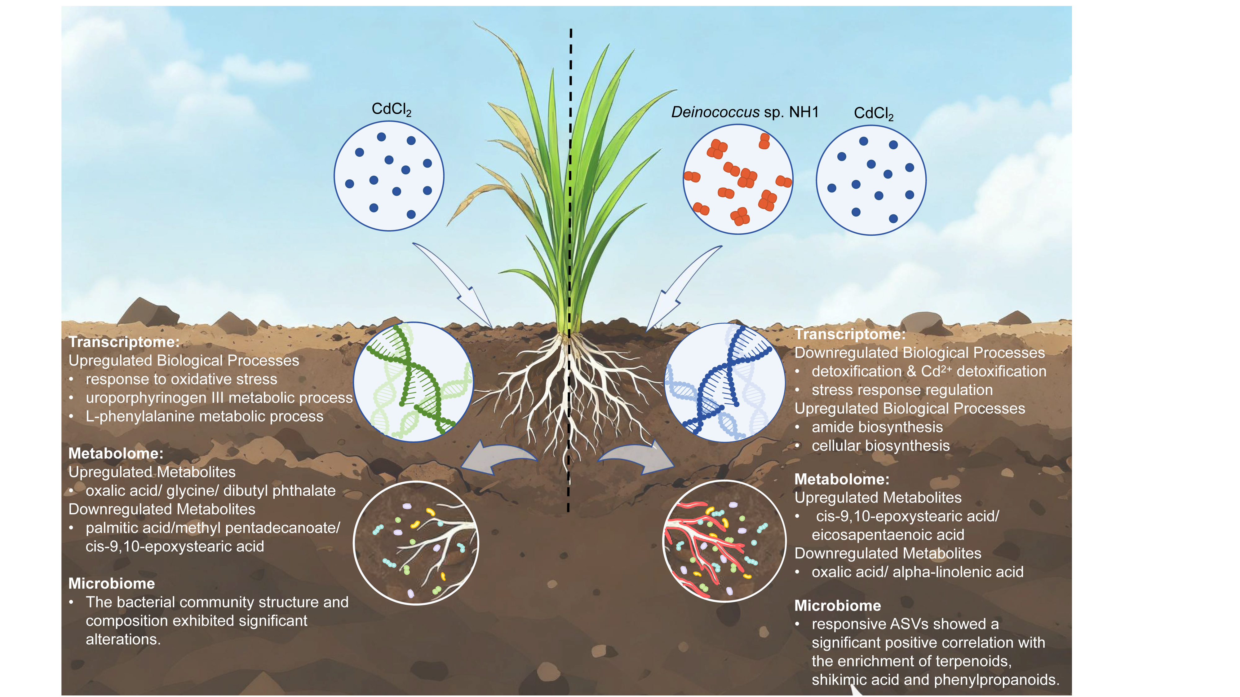 水稻安全生產常面臨土壤鎘污染的挑戰,利用功能微生物緩解鎘脅迫是一種綠色可持續的防控策略。異常球菌屬細菌對極端環境具有突出的耐受性,因此在重金屬污染修復領域展現出良好的應用潛力,然而其提升水稻鎘抗性的具體效應和作用機制尚不明確。研究團隊所篩選的異常球菌屬菌株Deinococcussp. NH1,能夠在鎘脅迫條件下顯著減輕水稻所受的毒害癥狀。該菌株通過多途徑協同緩解水稻鎘脅迫:首先,重塑根際微生物群落結構,恢復微生物多樣性并促進有益菌富集,從而促進水稻株高與鮮重的增加;其次,調控根系基因表達,下調與脅迫防御相關的基因,同時上調細胞生物合成等生長相關基因表達;此外,還能重構根際代謝物譜,提高脂肪酸、萜類等物質含量,進而驅動Massilia等有益微生物群落的響應。該研究成果為水稻鎘污染綠色治理提供了重要的微生物資源與理論實踐依據。